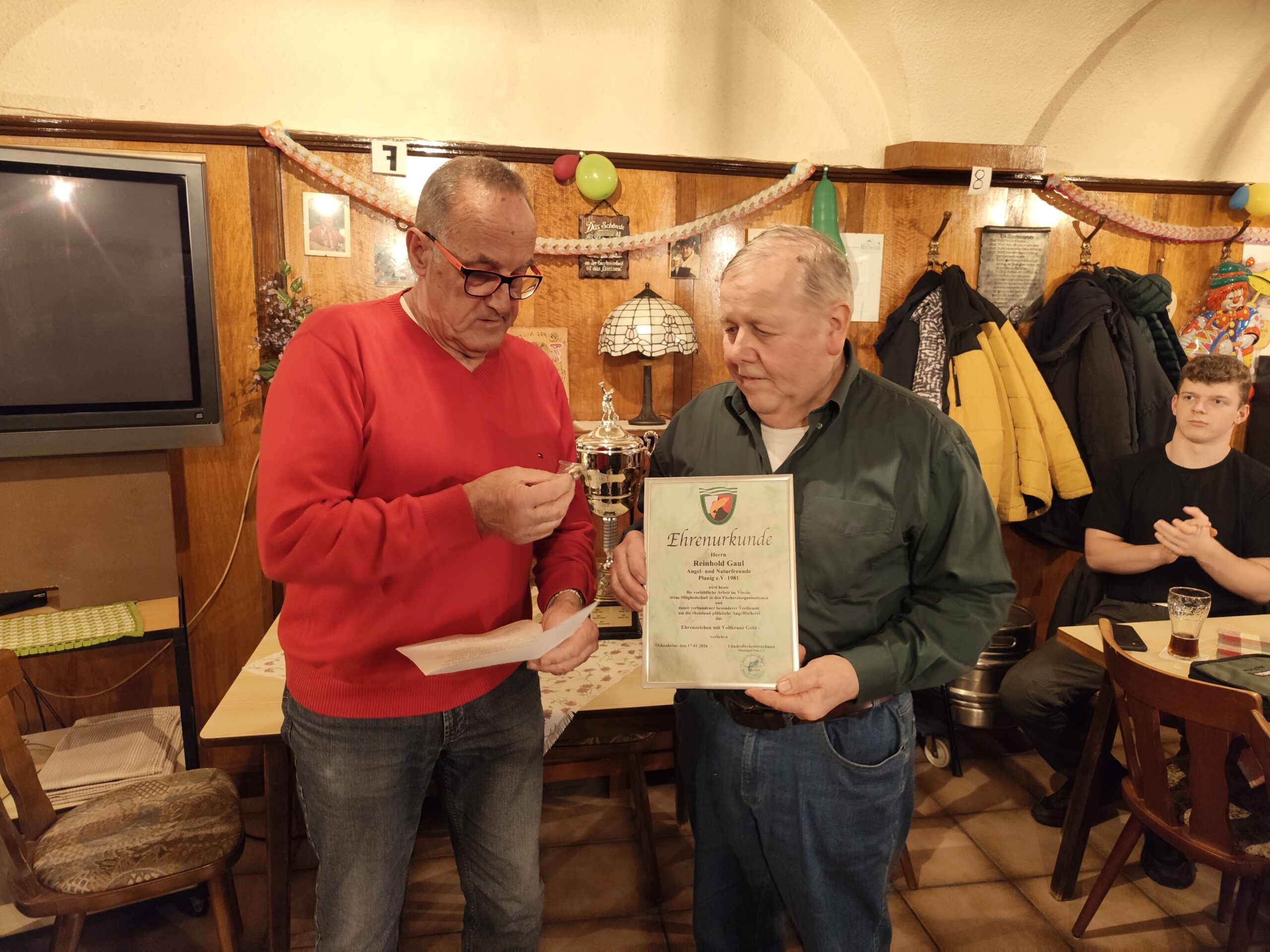 Eine besondere Würdigung erhielt Reinhold Gaul: Für seine 24 Jahre als 1. Vorsitzender wurde er vom Landesfischereiverband Rheinland-Pfalz mit dem Ehrenzeichen Halbkranz Gold ausgezeichnet. Damit wurde sein langjähriger Einsatz für den Verein offiziell anerkannt.